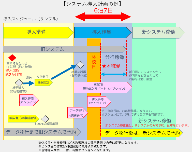 導入作業期間は、一般的に6泊7日を目安としており、その間は旧システムと並行稼働を行います。これにより、業務への影響を抑えながら、安全に新システムへ移行することが可能です。