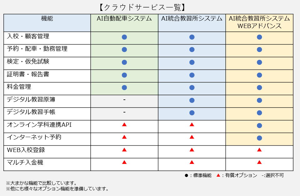 教習所の規模や運用方針に合わせて選べる、3つのクラウドサービスをご用意しています。