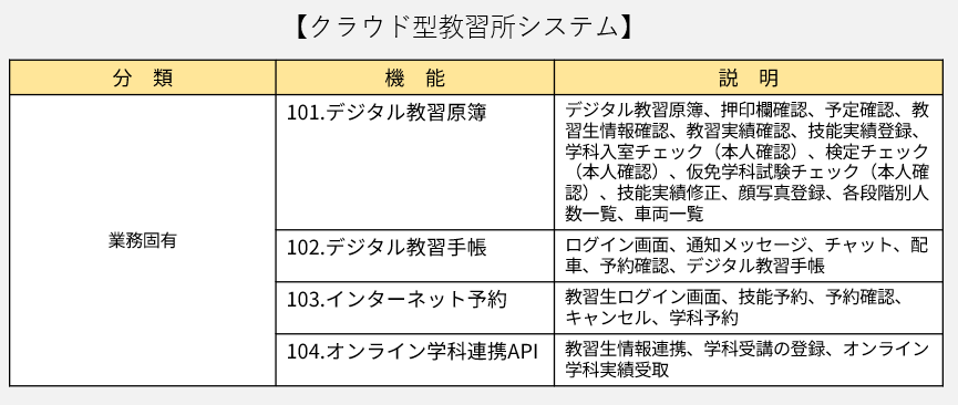 (AI統合教習所システムとインターネット予約、オンライン学科連携APIがセットになったサービス)