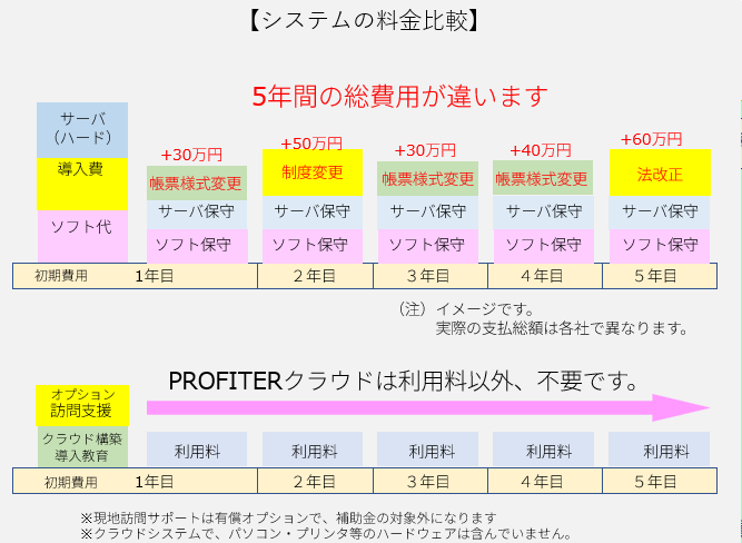 一方、クラウド型の「PROFITERクラウド」では、基本的に月額利用料のみで運用が可能です。サーバ保守や制度対応、システム更新などはサービス側で対応されるため、追加費用の発生を抑えることができます。
