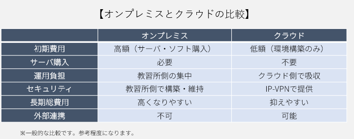 教習所システムは、これまでオンプレミス(自社設置型)が主流でしたが、近年はクラウド型への移行が進んでいます。