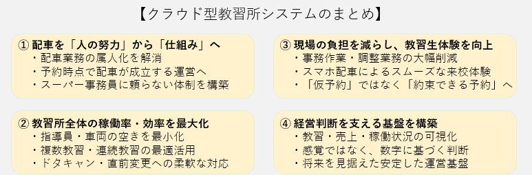 クラウド型教習所システムは、単なる業務のデジタル化ではなく、教習所運営そのものを進化させる仕組みです。