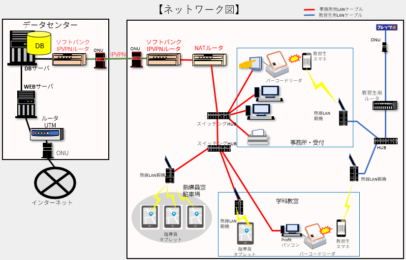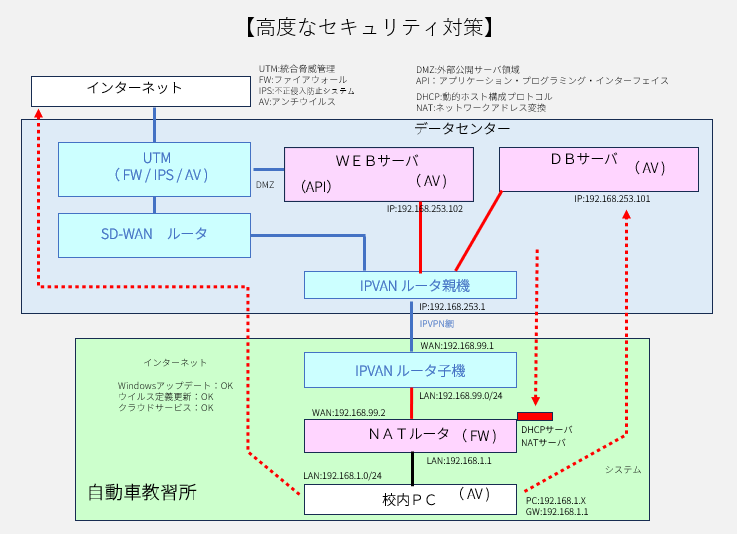 教習所とデータセンター間は、インターネットから分離されたIP-VPN回線で接続されており、外部からの不正アクセスリスクを低減しています。通信は閉域網内で行われるため、安全かつ安定したデータ通信が可能です。